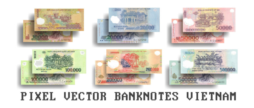 Vector set of pixelated mosaic banknotes of Vietnam. Denomination from 10000 to 500000 Vietnamese dong.