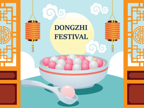 Dongzhi Festival Vector: Happy Winter Solstice Celebration with Tangyuan and Traditional Red Lanterns Illustration