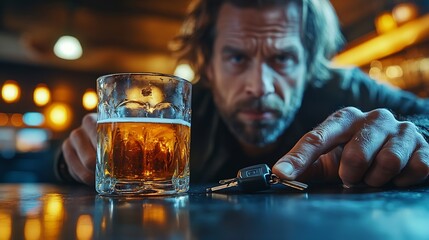 Drunk man with car key and alcoholic beverage in bar, closeup. Don't drink and drive concept