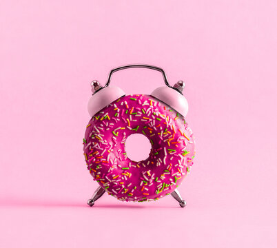 Creative art collage donut and alarm clock on pink background.