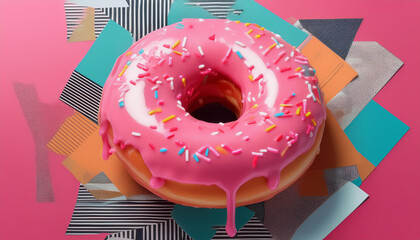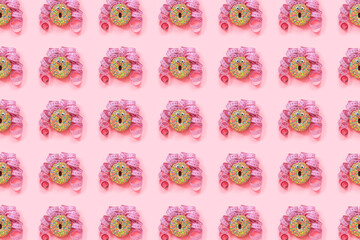 Donat pattern on pink background. Abstract funny face of woman from donut with eyes and hair from centimeter tape. Diet or unhealthy food concept Top view Flat lay