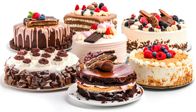 variety of cakes on the table isolated on white background