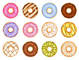 Large set of donuts in multicolored glaze with sprinkles. Assorted colorful doughnuts. Tasty donut set isolated on white background for cafe decoration or menu design