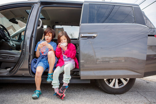 Two children sit side-by-side in an open van eating together