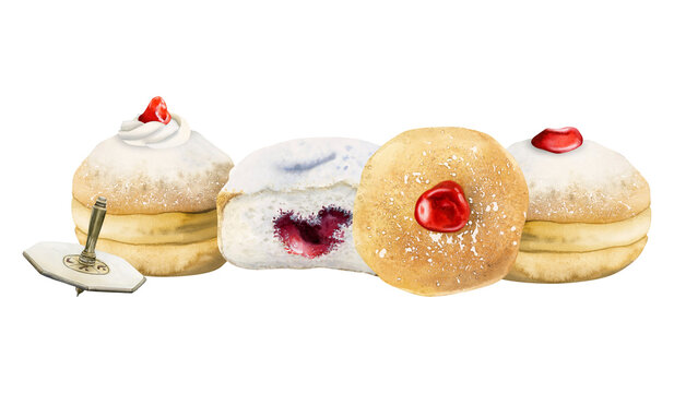 Hanukkah traditional donuts with dreidel watercolor illustration isolated on white background. Hand drawn Jewish sevivon, doughnuts, sufganiyah,. Chanukah pastry with strawberry jam