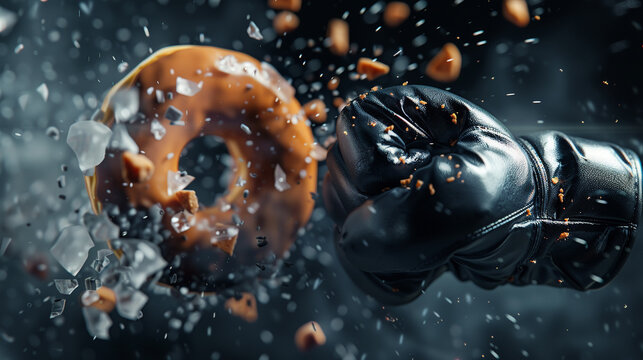 Tight shot of a glove punch shattering a doughnut wall, high contrast, motion blur, 3D concept