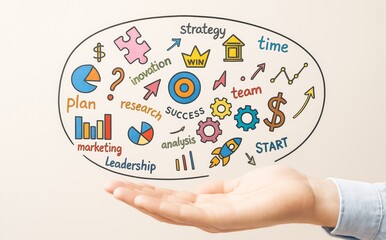 Business concept with hand holding colorful doodle icons representing strategy, teamwork, innovation, and planning on light background.