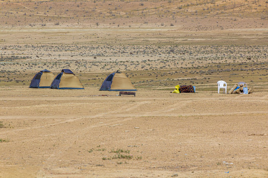 Tourist camping site near Darvaza (Derweze) gas crater (Door to Hell or Gates of Hell) in Turkmenistan