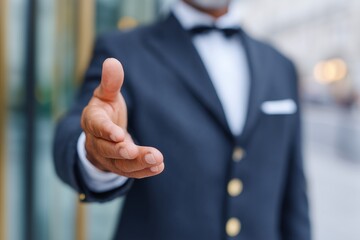 Faceless shot of hotel worker in black suit opening glass doorway to guest