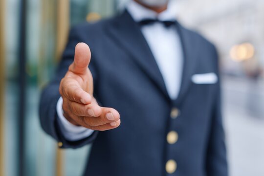 Luxury service gesture – Business man holding a door handle with blurred motion of a guest entering a high-end establishment