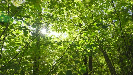 Swedish forest green trees sun fading through leaves. Warm bright sunbeam star illuminating branches dosh of lovely plants. Beautiful clean fresh environment nature in summer time in Sweden
