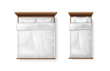 Single and double beds with white sheet, pillows and duvet top view. Vector realistic mockup of blank linen on wood beds, 3d furniture for sleep isolated on white background