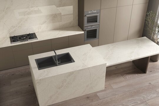 Luxury studio apartment kitchen interior, wooden flooring, warm white kitchen countertop, gray wall and window to city view, double ovens and inbuilt sink. 3D Rendering