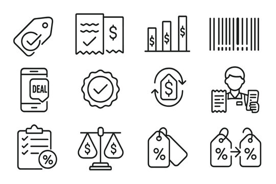 Price-Match Discount Icons. Line style icons of price-match discounts: tag with checkmark, receipt comparison, bar graph with