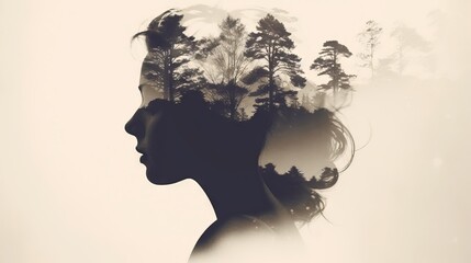 The artistic silhouette of a woman's profile, merging with the mystical forest landscape, creates a double exposure effect, emphasizing the unity of man with nature.