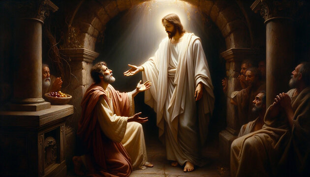 The Incredulity of Saint Thomas. Doubting Thomas. Jesus showing his crucifixion wounds. Digital painting, Generative AI