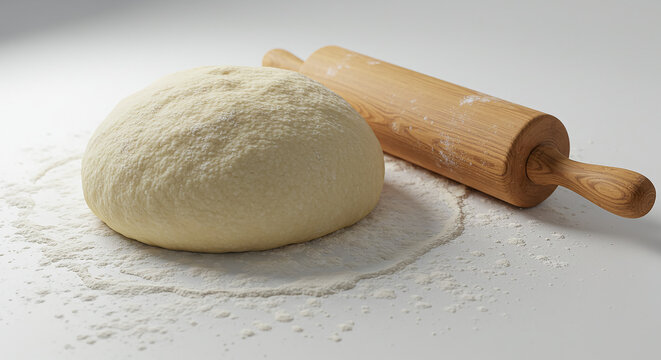 Classic wooden rolling pin with freshly prepared dough and dusting of flour on white background