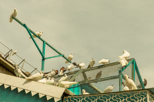A collection of cartoon pigeons in various poses, including flying, standing, and nesting, alongside wooden dovecotes and nests.