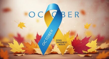 Down syndrome awareness month. Vector web banner, background, poster, card for social media, networks. Text down syndrome awareness month, october with blue and yellow ribbon.