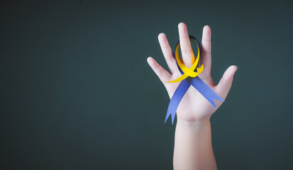 World Down syndrome day background. Down syndrome awareness concept. Socks and ribbon on blue background