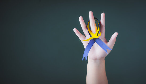 A banner image created for world down syndrome day 2025 with blue and yellow ribbons