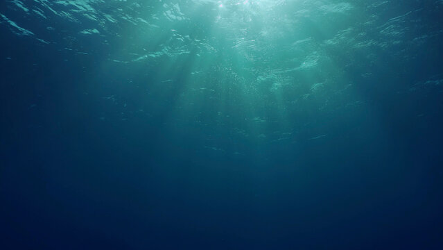 Dark blue ocean surface seen from underwater. Abstract Fractal waves underwater and rays of sunlight shining through