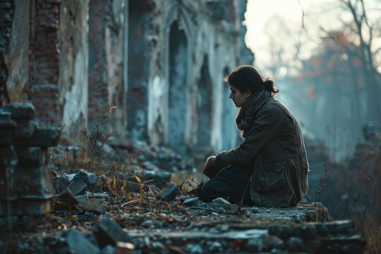Young Homeless Person Huddled, Begging, Against Brick Wall