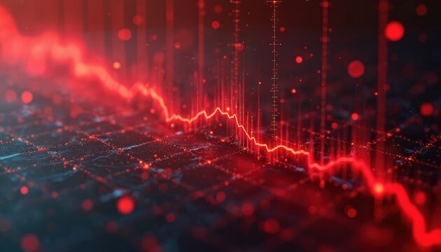 a downward arrow graph on a digital screen, symbolizing financial loss, with stock charts in the background, representing economic decline, recession, market downturn in modern business and finance