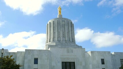 Salem Oregon Government Capital Building Downtown, Time Lapse at Twilight with Colourful Sky and Dark Silhouette of dome and Pioneer, USA