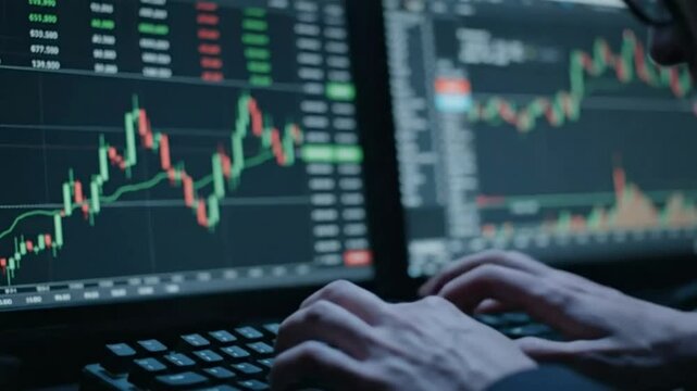 Stock Market Trading Downtrend. A trader types on a keyboard while a computer monitor displays a descending line graph, showcasing a downtrend in the stock market.