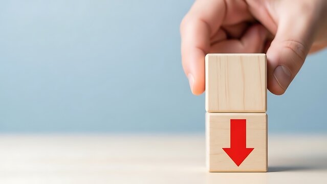 Hand stacking wooden blocks with red arrow pointing downwards symbolizing economic downturn and financial loss on light background