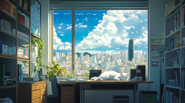 An open office with a white cat dozing on a wooden desk, sunlight casting a gentle glow over the space and an anime-inspired Rio de Janeiro skyline framed by a large window