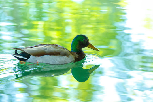 Two wild mallard ducks, a drake and a hen, swim on the green water of a tranquil lake, their feathers reflecting nature