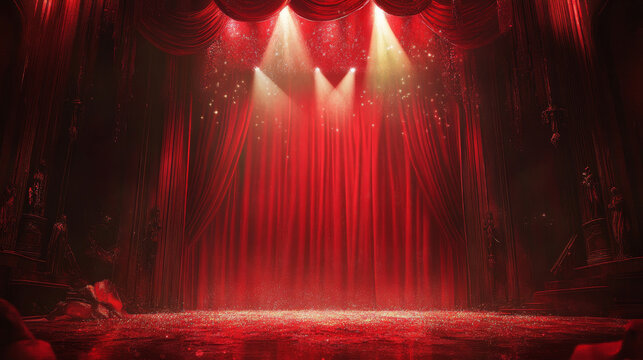 Theater stage. Red curtains stage, theater or opera background with spotlight. Festival night show banner.