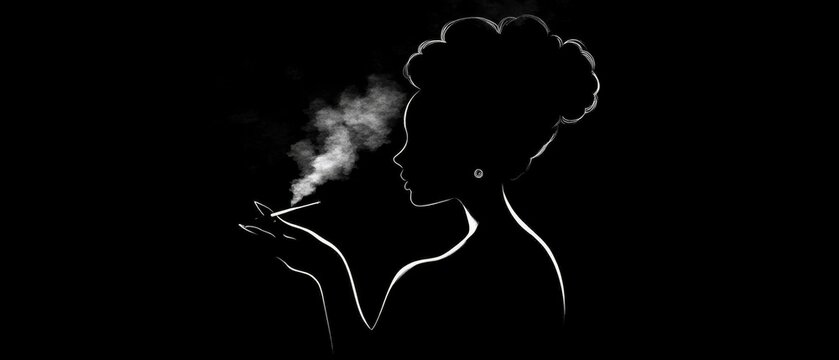 Silhouette of refined woman smoking, her elegance highlighted by gentle smoke trails in dramatic lighting, embodying classic allure