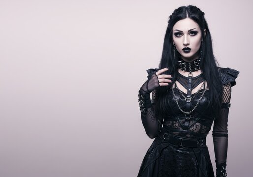 Portrait of a stunning techno goth woman with dramatic makeup and outfit
