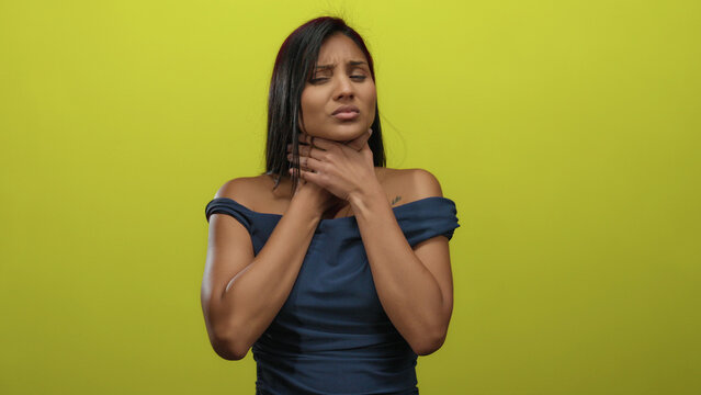 Sporty young woman taking deep breath with eyes closed, feeling calm and focused in dramatic green neon studio lighting with smoke effect