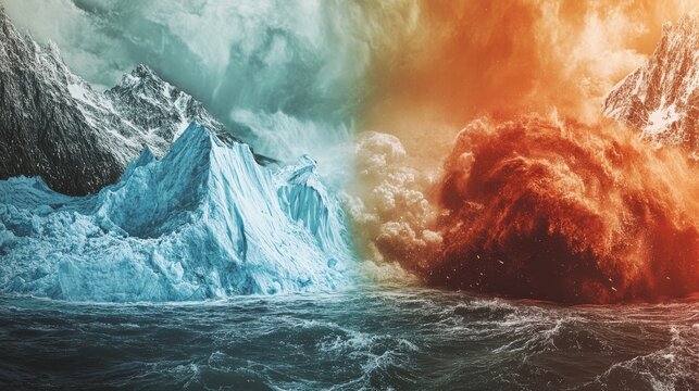 2.A high-impact visual of a melting glacier on one side and a raging typhoon on the other, representing the drastic weather changes linked to the El Niño and La Niña climate phenomenon.