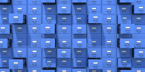 Archive file cabinets blue color background. Open drawers. 3d illustration