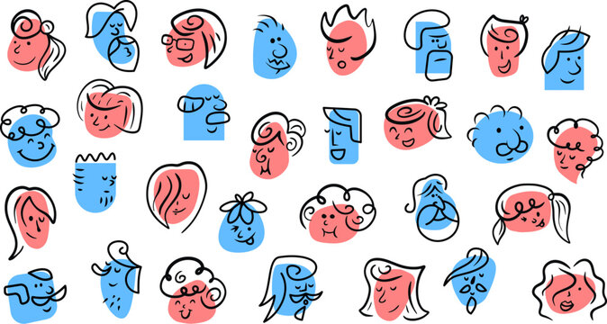 Set cartoon abstract human head in funny simple doodle draw style. Bright fashion emotion faces various people. Bright design character emotion. Collection flat vector illustration.