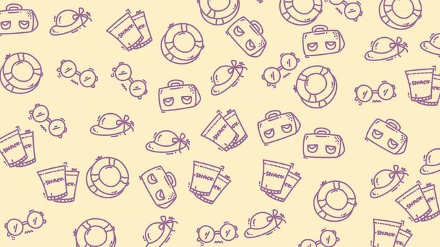 Summer themed pattern with surfboards cocktails seashells and flipflops in line art.