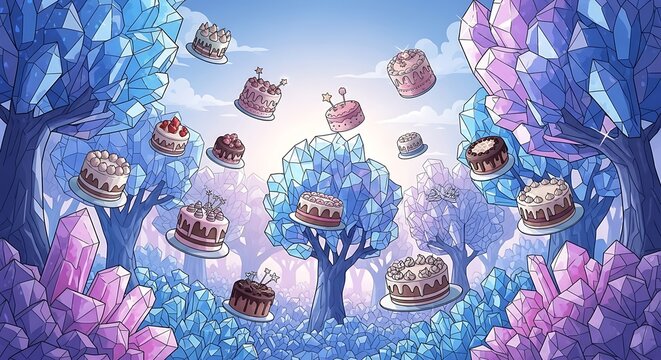 Enchanted Cake Forest - A Whimsical Fantasy Landscape with Floating Cakes.