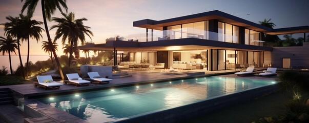 Luxurious coastal dream house surrounded by serene beach landscapes, suitable for highend property brochures