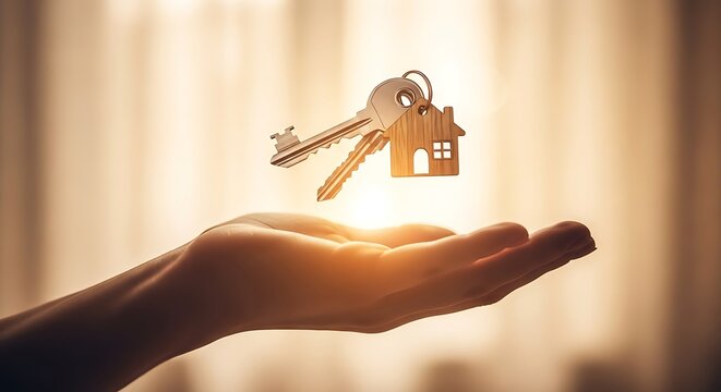 Family and home concept, man and woman with little son holding house symbol. Childhood and parenthood, happy moments of life, dream about country house, farmers family planning building own house