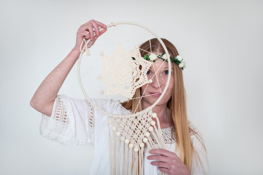 The innocent image of a young woman with long hair in a pink wreath and a white dress on a white background in the studio, in the hands of a dreamcatcher of pastel cotton threads. Purity and Harmony.