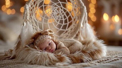 Newborn Baby Sleeping on Fur with Dreamcatcher and Soft Lights