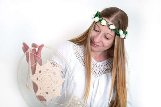 The innocent image of a young woman with long hair in a pink wreath and a white dress on a white background in the studio, in the hands of a dreamcatcher of pastel cotton threads. Purity and Harmony.