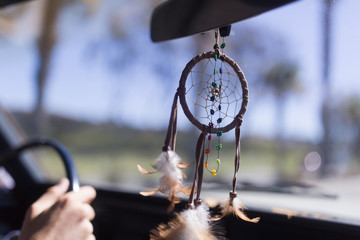 Close up of dreamcatcher hanging in the car