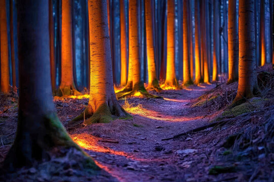 Serene forest path illuminated by glowing trees creates dreamlike atmosphere, inviting exploration and wonder