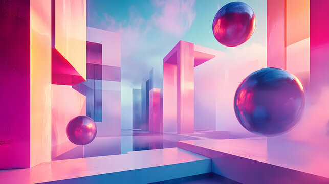 Surreal architectural dreamscape with abstract geometric forms and mystic floating spheres in vivid hues. Architectural Paradoxes. Illustration